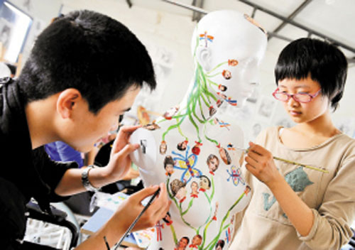 双腿截肢的魏仪君(左)和右臂截肢的李丹在创作“新生命”。