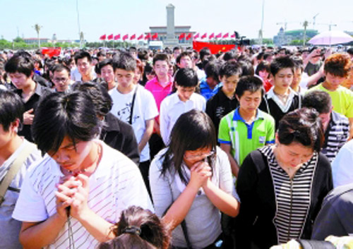 5月12日14时28分,群众在天安门广场为遇难者默哀