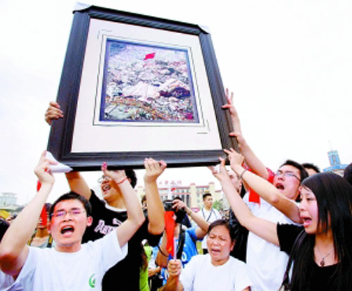 5月12日,成都市民在成都天府广场高举一幅手绣作品,纪念“5.12”汶川大地震一周年。