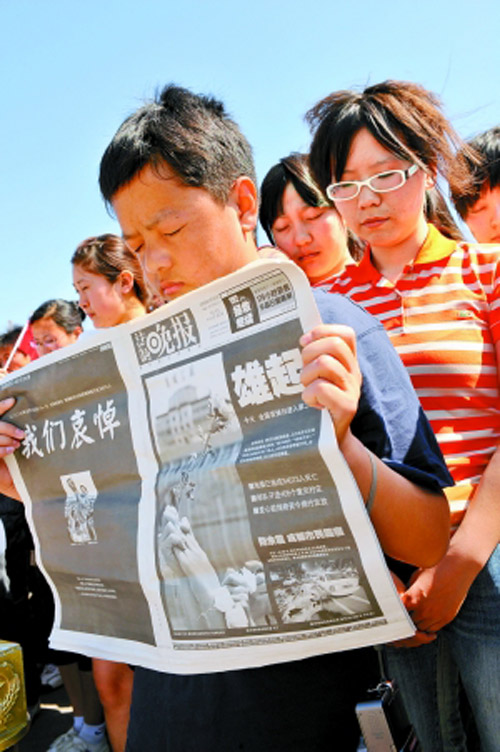 5月12日14时28分,北京一位小男孩手举报纸为地震遇难者默哀。