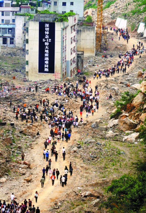 5月12日,北川和从全国各地赶来的群众在北川老县城悼念亲友。