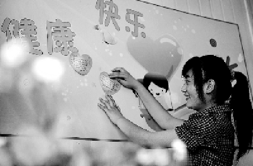 5月11日,杨瑶在木鱼中学心理健康辅导室布置板报。