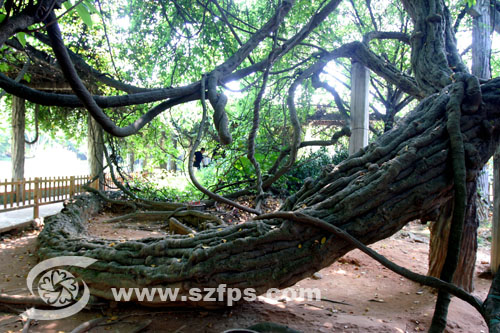 3.何仙姑家庙旁的盘龙古藤已有千年历史,由青藤绕着一棵古榕树和几棵杂树繁衍而成的。古藤树冠覆盖范围500多平方米。茎干如卧龙在地上空中蜿蜒30多米,最高处3米多,有些地方甚至完全埋入地下。据国内专家鉴定古藤学名为“白花鱼藤”,是我国稀有的植物。但他们也辨别不清古藤的源头何在。古藤每年6月中下旬开花,花朵状如米兰,为白色,花期约10天,8月结果。