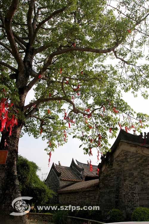 5. 报德祠左侧有一棵木棉古树,旁有文字陈述:“……木棉已有七百多年历史,文革时期因祠庙被毁而慢慢枯萎……一直被当枯木对待。有人欲砍伐作木材,但斧不入且缺口生锈,砍者手臂痛肿数月而不得动弹。1999年祠庙修复之后,树又重现生机……”。木棉花树与何仙姑桃、挂绿并称增城“仙花、仙桃、仙果”。