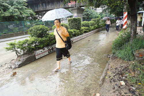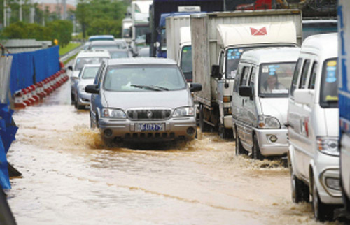 昨日,大雨积水致使福龙路驶向龙大高速的车辆堵塞数公里。