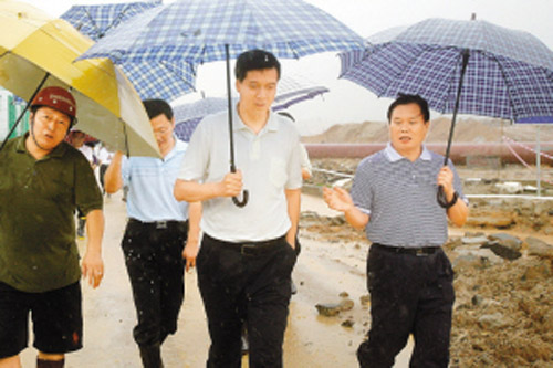宝安普降大雨,宝安区委书记周林祥(中)、区长李文龙(右)