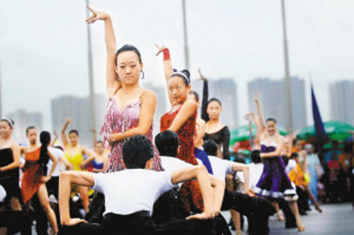 风中展翅,雨中亮相。一群年青人在南山区后海公园为公众激情献舞。