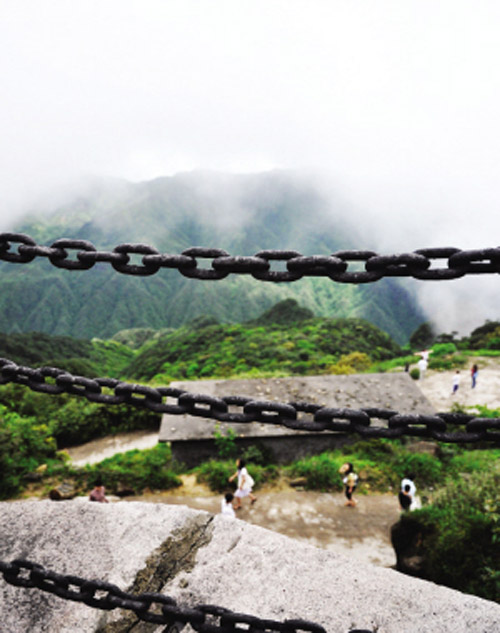 车过天门,盘旋而上的山路越来越陡,山势也渐近。只见林海苍莽,聚气藏风。一路过来,偶尔也会遇见三两棵红桃白李,或一些不知名的花儿,在这幽深的山中寂寞地灿烂着。慢慢接近第一峰,发现不远的山峰上早已云雾缭绕,游人来到广东第一峰,都会祈祷希望能看到蔚为壮观的云海奇观。车行至峰顶停下,游客开始下车登顶,过多久便上到峰顶。站在此处极目远眺,微阴的天空下,被云雾包围有种腾云驾雾,飘飘欲仙的感觉。偶尔云雾散去,山色苍碧,“会当凌绝顶,一览众山小”,尤显壮阔。对面山上的蛤蟆石在云中仰天而立,仿佛吞吐着“仙气”。再看来时的山路,如一条亮丽的绶带飘游在苍翠的山腰,美不胜收。