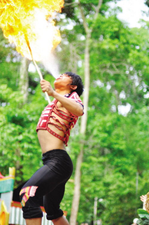 蓝田瑶乡遍布原始森林,踏入蓝田瑶族风情园如进入世外桃源,原始清新的蓝田山水和淳朴神秘的瑶族生活令人如入梦境……古木参天的原始森林、俏丽的瑶家姑娘、黝黑的瑶山“阿公”、敦厚热情的蓝田小伙、原始神秘的瑶民穴居……这就是仙境般的七彩瑶乡。蓝田瑶族风情园除了美丽如画的瑶乡风景,还荟萃了多彩、神秘、独特的千年瑶族文化,如传承千年的非物质文化遗产代表作——瑶族舞火狗仪式,是岭南民族文化发展变迁的一块活化石。瑶族奇特的深山抢亲、“不落夫家”的瑶王招亲、求婚洞和爬楼恋等奇风异俗,场面壮观的祭祀活动,纯朴的瑶族工艺,传统的瑶家美食……无不撩人心扉。