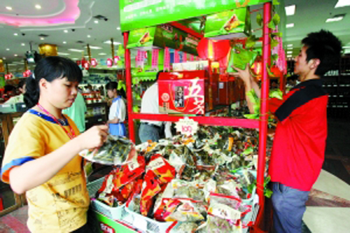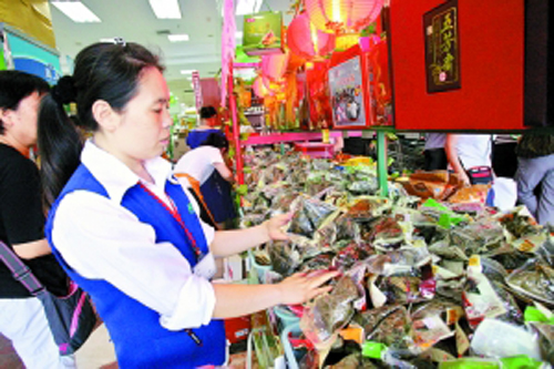 实施方案:目前,各大商场围绕粽子都做足了文章。在海雅、岁宝、天虹的超市里,我们会看到不同品牌各种口味的粽子都已经摆在最醒目的位置,品种丰富,有豆沙、咸肉、红枣、叉烧等,其中传统的蛋黄咸肉口味的粽子最受消费者青睐,豆沙枧水、莲蓉枧水、栗子咸肉等口味也受到市民热捧。而且,各商家也推出了粽子等应节商品的促销活动。如在天虹超市,购粽子满48元即可加2元换购精美端午节礼盒包装一个;而在岁宝,端午节当天,在其各分店超市购物满一定金额,赠送环保袋等礼物。