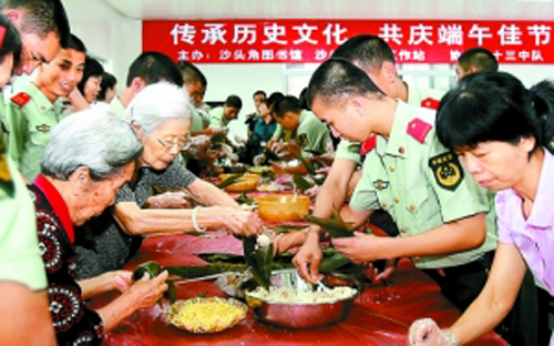 日前,广东边防第六支队十三中队、沙头角图书馆、沙头角社区工作站,一同邀请了盐田区沙头角福利中心的23名老妈妈来到部队一起包粽子、尝粽子,喜迎传统端午节的到来。