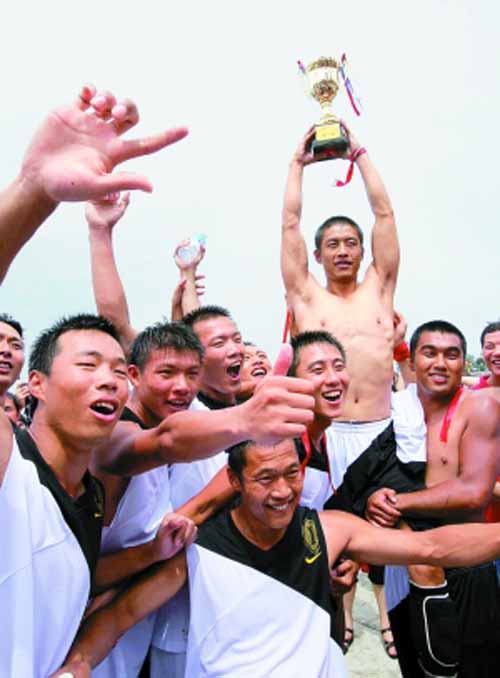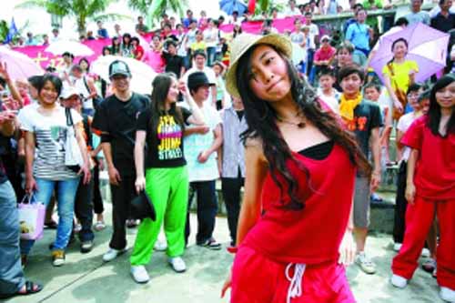 岸上的拉拉队美眉跳起街舞为队员喝彩。