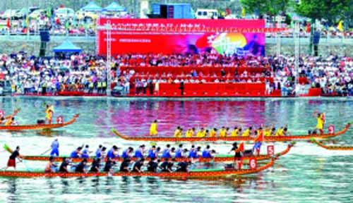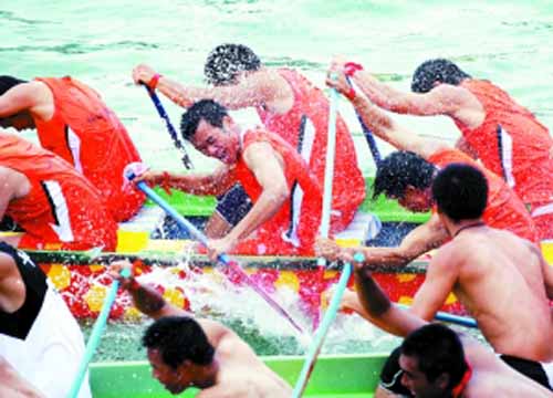 上午9时,龙舟赛正式开始。参加第一轮比赛的6支龙舟队各自在划定的海域准备开赛。每条龙舟上有20名壮实的青年、一名鼓手和一名舵手。随着发令枪响,龙舟队员齐齐把桨插到水中,锣鼓齐鸣,6支龙舟飞奔出去,激起阵阵浪花。