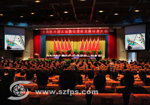 龙岗区共迎大运旗促进新发展动员大会上观看深圳市的代市长王荣从国际大体联主席基里安手中接过大运会会旗的播出,这正式标志大运会已进入“深圳时间”