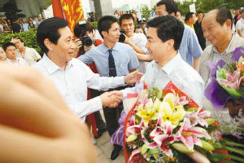 王荣代市长率深圳代表团接旗归来,受到刘玉浦书记等热烈欢迎。