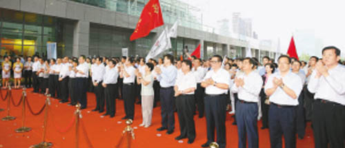 昨天下午,我市几套班子领导和各界群众在市民中心举行隆重而简朴的迎旗仪式。
