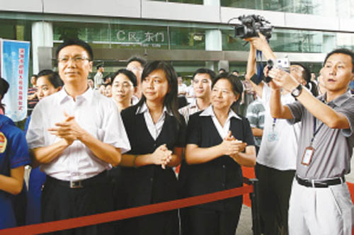 昨天下午,市民中心B区贵宾通道举行的深圳市迎接“大运会”会旗仪式现场成了欢乐的海洋,来自深圳各高校的大学生、热心的市民纷纷畅抒胸臆,尽情表达各自对迎接大运会会旗、深圳大运会的期盼和激动心情。