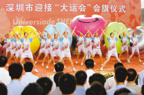 青年学生载歌载舞,尽情表达迎接大运会会旗、期盼深圳大运会的激动心情。
