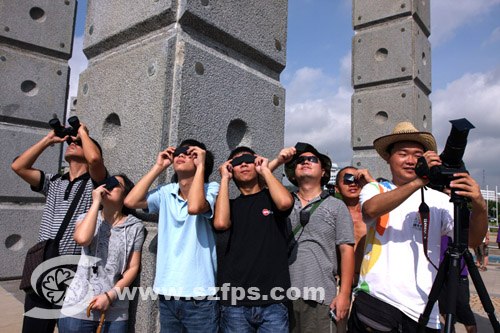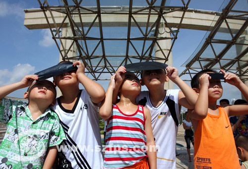 在龙城广场观看日偏食的市民