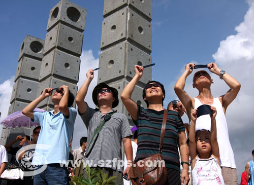 据说500年一遇且持续时间最长的日全食在7月22日来临, 昨晚上用X光片做了个简易的滤片,为目睹到日偏食的美妙光影今早上7点半就到龙城广场,龙城的市民群众在上午8时就开始慢慢聚集起来。男女老少的,你一句我一句,好不热闹。都对这百年不遇的景观大为赞叹。