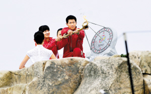 8月1日,奥运冠军王峰(右)和张娟娟采集圣火火种。寓意“国泰民安之火”的第十一届全国运动会圣火,在泰山之巅成功采集。