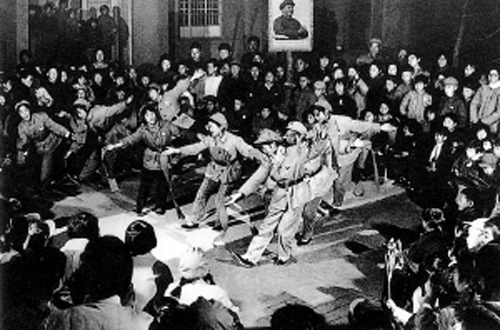 ■忠字舞■盛行于1966~1968年间的一种狂热地表示忠心、忠诚的集体舞蹈。跳舞时手里通常以《毛主席语录》(红宝书)或红绸巾作为道具。忠字舞因此也成了一个时代的象征。与之相类似的还有语录歌。