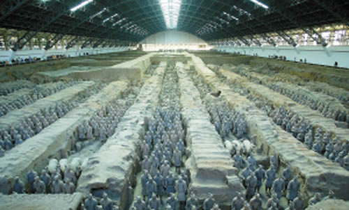 今天,我们在兵马俑博物馆大棚所遮蔽的挖掘现场凭高下望,就可以看到2000多年前秦始皇皇家部队的阵容:6000多步兵及少部分战车、由89辆战车构成的“机械化快速部队”和皇家御林军。目前,尚有好大一片葬域未发掘,再加地下未知的葬域,这个场景,应该只是局部而已。“局部”就如此壮观了,全局呢?唐代诗人杜牧曾吟唱道:“秦王扫六合,虎视何雄哉”,此言不虚也。