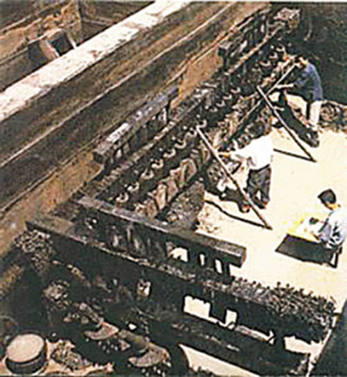 ▲曾侯乙墓编钟出土原状。(资料图片)