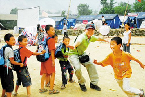 在四川灾区与小朋友一起做游戏.(图片由受访者提供)