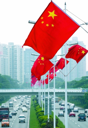 宝安大道上,五星红旗格外醒目。 记者万 晖 摄