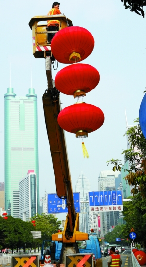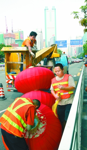 工作人员在深南路段悬挂灯笼。 记者薛云麾 摄