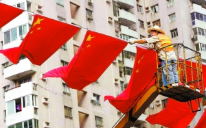 工作人员在南海大道悬挂国旗。记者陈锡明 摄