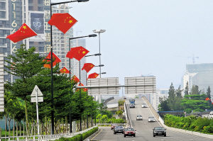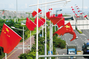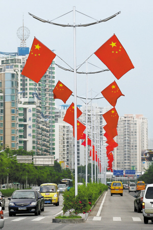 十几公里长的滨海大道,是深圳最漂亮的景观大道之一,在新中国成立60周年来临时之际,受市城管局委托,南山区首次在这条大道悬挂国旗。远远望去,随着道路起伏延伸的面面国旗仿佛两条红色的巨龙,让本来就亮丽的滨海大道增加了一层独特的风景;行车上路,一面面国旗从眼前掠过,五星红旗的巨龙又成了奔腾的血脉,激荡着深圳儿女的赤子之心。