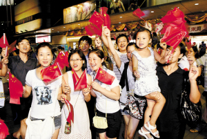 记者昨日来到南海大道,看到这条长达7公里的南山主干道上,整齐划一悬挂着1600多面五星红旗,路面上,车流滚滚,路上方,鲜艳的国旗随风飘动,就像红色的海洋,给整个南海大道增添了一道亮丽的风景。昨日上午,南山区委区政府大院内也是热闹非凡,上午9点多,一幅约600多平方米的巨型国旗悬挂在区委区政府办公大楼东侧,巨幅国旗迎着早上初升的太阳,在碧绿色的大楼玻璃幕墙的衬托下分外夺目,引起过往市民纷纷驻足观赏。深圳大学七名女大学生还专门在国旗前留影。来自东莞某公司的八名员工看到巨幅国旗也兴致盎然,表示不虚此行。