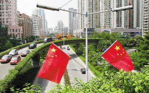在深南大道沙河东路十字路口,18面国旗层次分明悬挂在一棵洁白的人工树干上,这就是南山区市民引以自豪的“国旗树”。