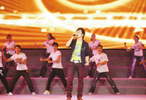 伴随经典歌曲《爱我中华》,身着56个民族服饰的舞者翩翩起舞,激情昂扬的音乐在广场上空久久回荡:五十六个星座五十六只花,五十六族兄弟姐妹是一家,五十六种语言汇成一句话,爱我中华爱我中华爱我中华……
