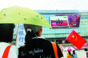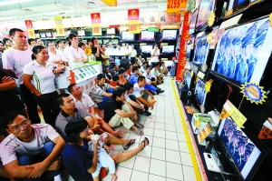 商场内挤满了观看国庆60周年阅兵庆典的市民