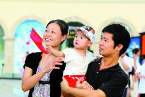 一家三口在街头,通过大屏幕观看国庆大阅兵