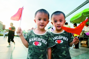 双胞胎睿睿、昊昊兄弟手持国旗庆祝国庆