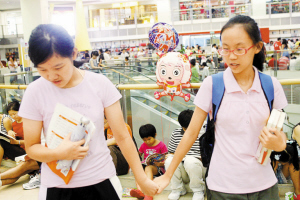 好朋友手拉手一起逛书城。