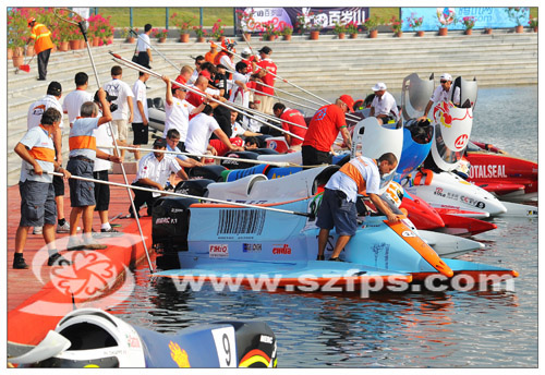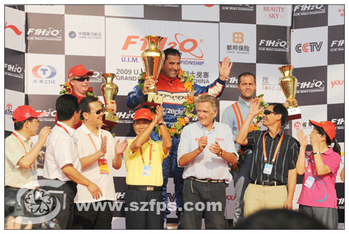旌旗招展,人声鼎沸,10月17日,2009F1摩托艇世界锦标赛中国深圳大奖赛第三次在深圳南山后海F1赛场打响,在首日的积分赛角逐中,来自赛泽普特队的赛手高迪奥•卡佩里尼加冕冠军,继07赛季之后,这位年过五十的“九冠王”再次问鼎深圳大奖赛,成为十连冠。中国招商银行队赛手皮埃尔•伦迪获得第五。辛格竞技队的弗朗西斯科•卡塔多和阿塞拜疆队的约纳斯•安德森分获二、三名。 另一名中国天荣F1摩托艇招商银行队费比恩•卡尔索取得了第九名的成绩。
