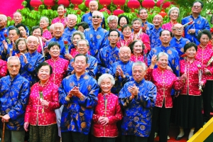 中国老年保健协会会长李深在招待会上说,尊老、敬老、助老是我国传统美德和中华民族宝贵精神财富,是中国特色社会主义核心价值观的组成部分,也是民族兴旺发达的象征之一。在举国同庆新中国60华诞的喜庆时刻,我们在全国推选出一批长寿老人举办“共和国万岁宴”是双意叠加:与会嘉宾老人年龄相加大于一万岁,更是共祝新中国万岁。