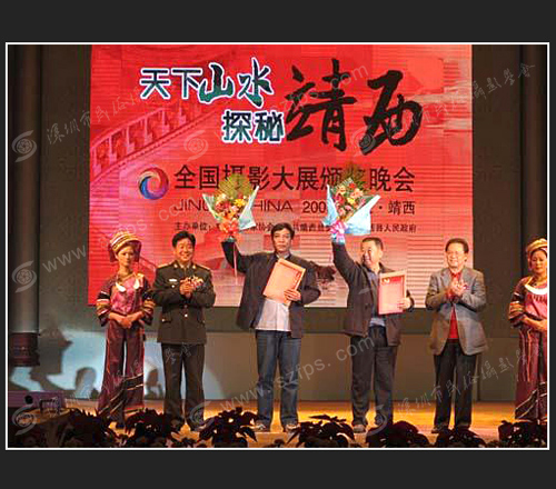 12月22日晚,“天下山水.探秘靖西”全国摄影大展颁奖晚会在靖西县人民会堂隆重举行,中国摄影家协会副主席张桐胜、中国摄影报社社长助理、活动部主任方焕然、广西文联主席潘琦和百色市、靖西县等领导及广西众多摄影家、摄影爱好者参加了颁奖晚会。我会副秘书长李明带队的“09年9月10日广西靖西山水风光民俗风情五日摄影采风团”,有汪秦生、陆余昌、刘晓薇、陆霭共同参加,经大赛组委会专家评选结果.我会副会长汪秦生的《捍卫》获得金质收藏作品,奖金20000元,李明的《亲情》获得优秀奖。