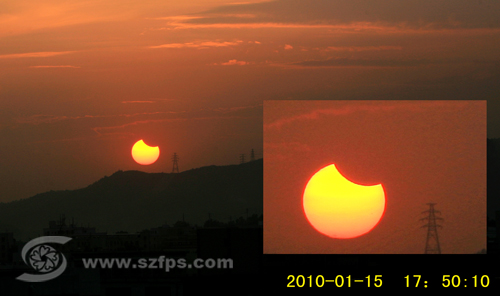 市气象局专家表示,这次深圳处于偏食地带。偏食发生时,太阳正处于西南方上空,并越来越靠近地平面。