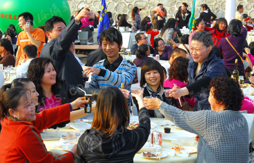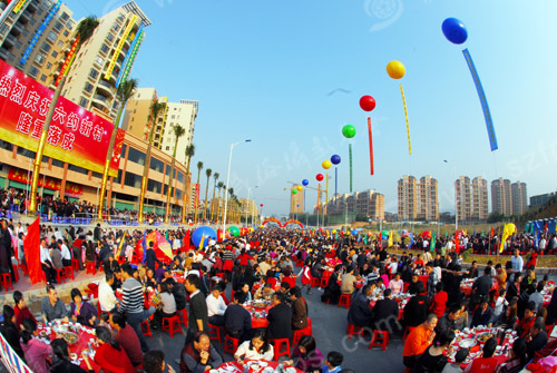 下午2点多,按照客家传统风俗举行的落成典礼规模宏大,庆典仪式后,热情好客的六约村民更在小区外广场依照客家风俗设下1500席,可容纳15000人同时进餐的客家“大盆宴”,盛情邀来上万宾客共同分享乔迁新居的喜悦,在随后举行的文艺晚会上,著名歌唱家祖海和香港知名歌星陈惠娴也到场倾情献歌。摄影师们纷纷举起相机记录下了这一宏伟壮观的场面。