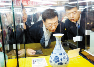 收藏爱好者在欣赏一件交易起价210万元的元代青花玉壶春瓶。