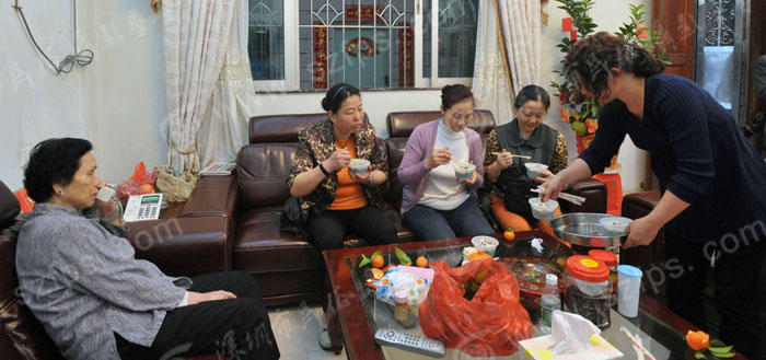 “开丁茶”其实是一种饭食,由蔬菜、海鲜、肉类、小吃和汤分次序混合而成,共13样(正好与正月十三相对应)。“开丁茶”用料丰富,味道格外甜美。据介绍,“开丁茶”之所以叫“茶”,是因为过去以茶水代肉汤的习惯。以前“开丁节”主要是针对生男孩的家庭,过“开丁节”时,男孩是最受欢迎的,每家都希望有新生男孩到家里来吃“开丁茶”。现在,不管男孩女孩,不论家中是否添丁,渔二村的老百姓同样热情地邀请亲朋好友进屋吃“开丁茶”互相祝福。他们也喜欢走街串户互送吉祥祝福,想祝福哪一家,就到哪一家去吃“开丁茶”。谁家来吃“开丁茶”的人多,就意味着新的一年里谁家会更加人丁兴旺、财源广进。我会会员们来到了居民马秀梅家里。马秀梅今年75岁她家每年开丁节都要接待300多人。除了吃“开丁茶”这一传统习俗外,渔二村还举办了许多具有民俗风情的文艺表演,会员们用相机记录下了一个个精彩时刻,共同欢度这个热闹而隆重的节日。