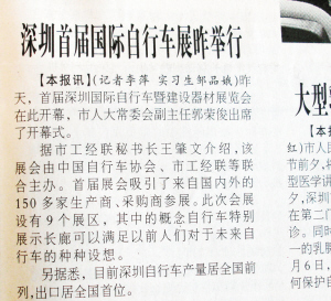 首届深圳国际自行车暨建设器材展览会开幕。目前深圳自行车产量居全国前列,出口居全国首位。