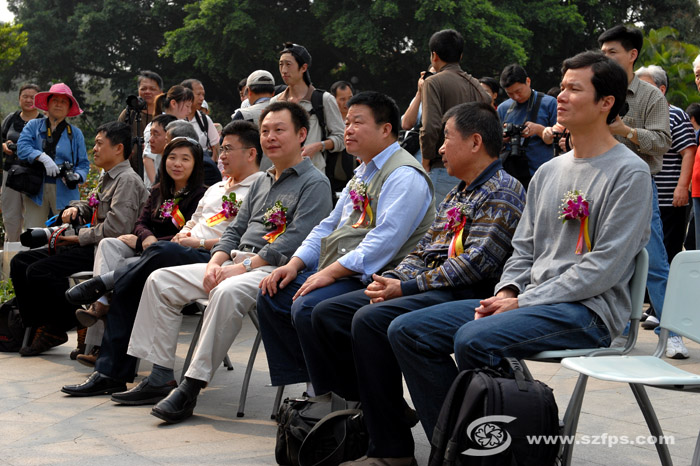 出席活动的嘉宾有深圳市城管局园林处陈德华副处长,深圳市人民公园管理处梁副主任、黄副主任,深圳市民俗摄影学会刘对现会长,汪秦生、石践、陈锦辉副会长。以及深圳市民俗摄影学会会员,同时也邀请了摄影界的朋友:老年摄影学会、快乐摄影网、现代摄影网、橡树摄影网、边防七支队一大队武警官兵的影友共约300人左右。