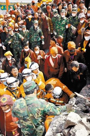 摘自:深圳特区报  4月18日,在青海玉树地震救援现场,众多群众围在搜救点期盼奇迹发生。